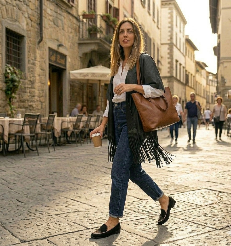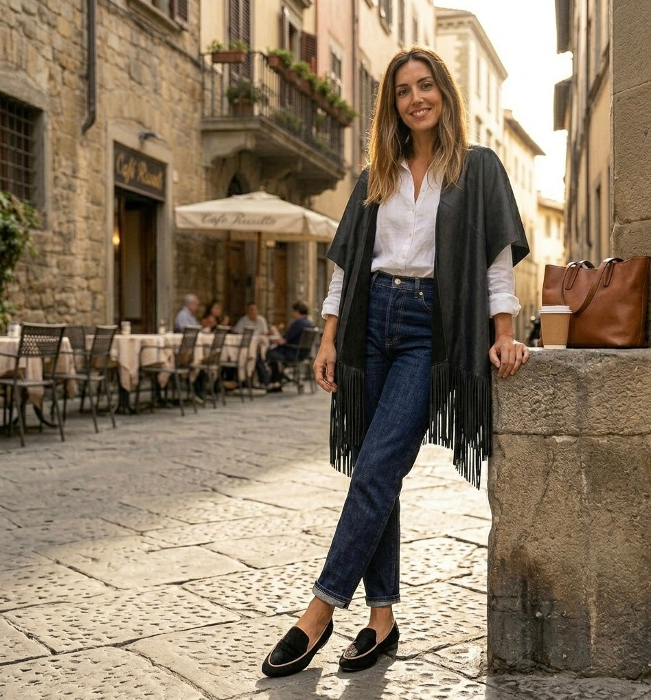 Ruana Pampa flecos cuero negro